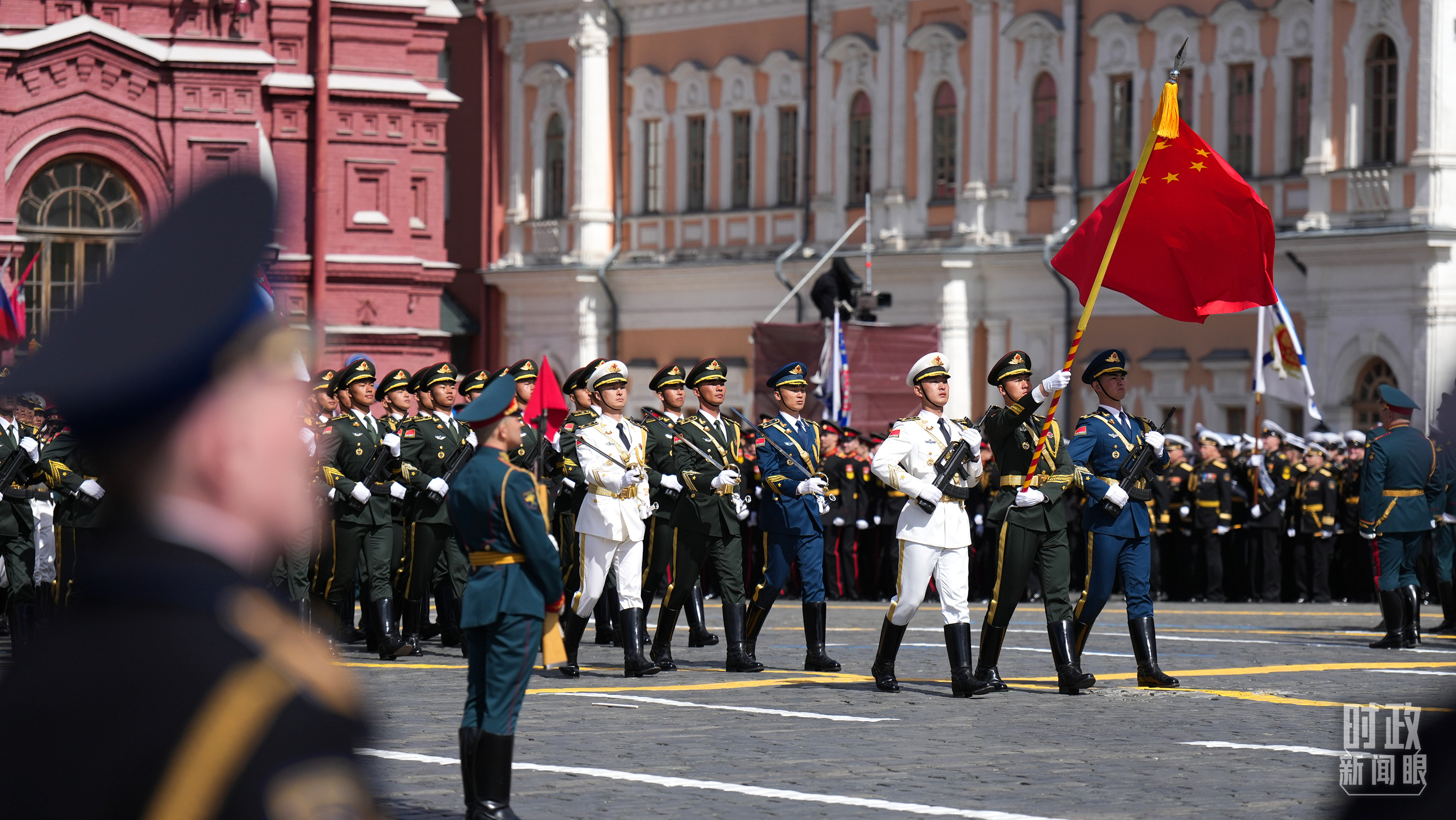 中國人民解放軍三軍儀仗隊方隊軍容嚴整、士氣高昂,邁著堅定有力的步伐走過紅場。(總臺記者李晉拍攝)