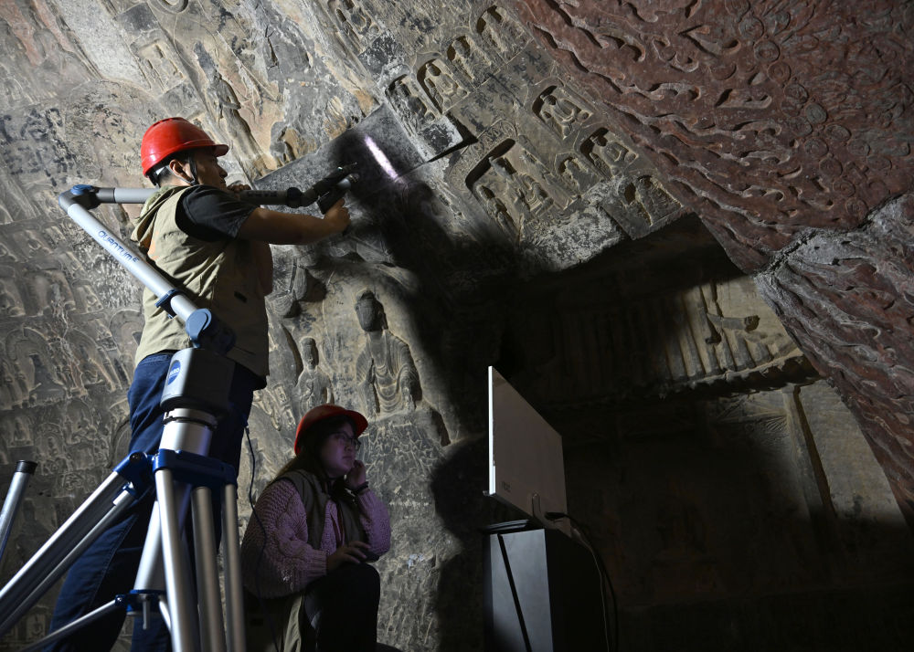 2025年4月9日,龍門石窟研究院工作人員在古陽洞使用關(guān)節(jié)臂掃描儀對像龕進行數(shù)字化掃描。