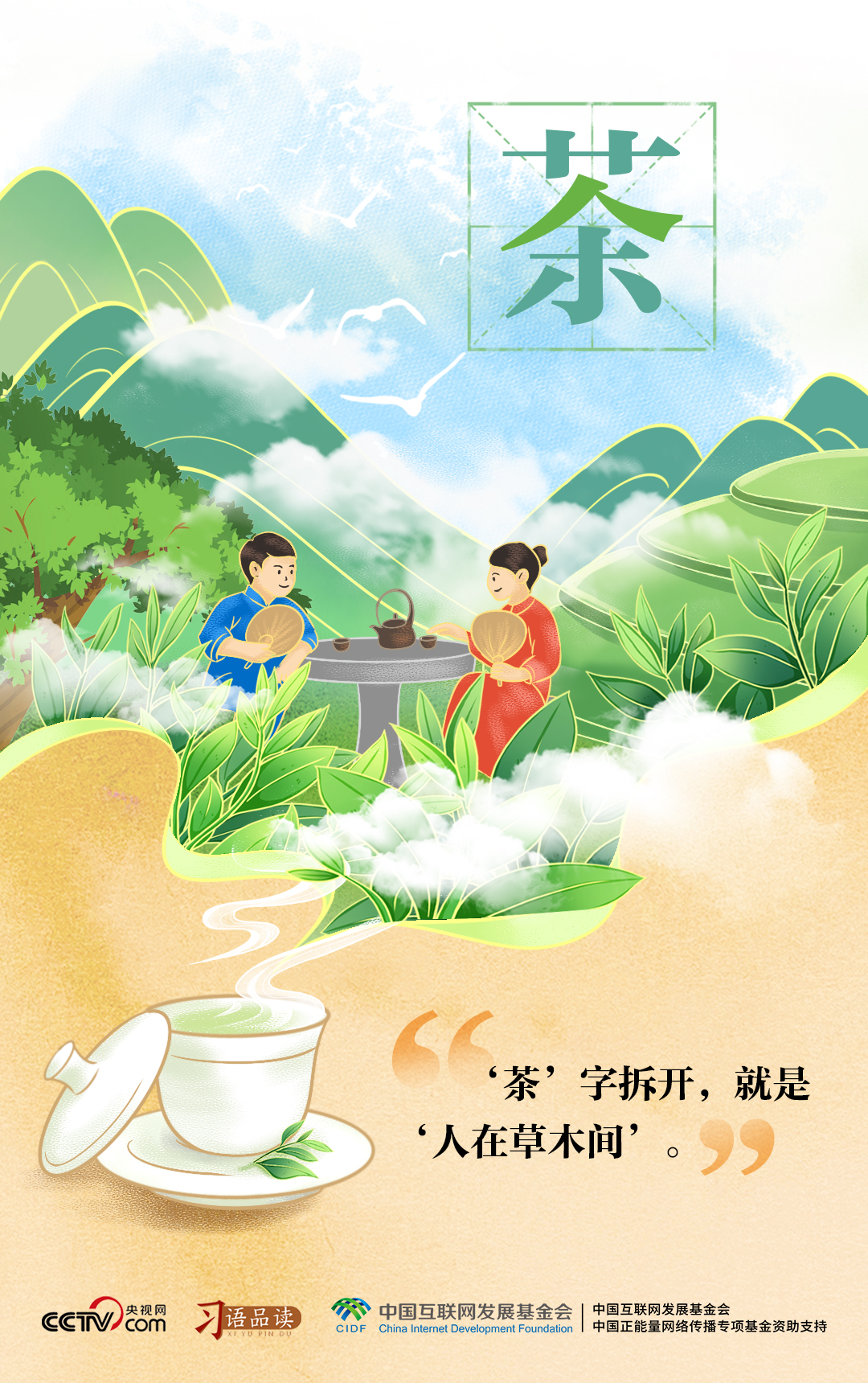 不同的交流場景,蘊藏著相通的茶文化??倳浵葘ⅰ安琛弊植鸾鉃椤叭嗽诓菽鹃g”,形象描繪種茶、采茶、制茶和飲茶過程中人與自然和諧共生的畫面。之后,總書記又以“因茶致富”“因茶興業(yè)”闡釋茶的經(jīng)濟價值和賦能千行百業(yè)發(fā)展的多元價值。
