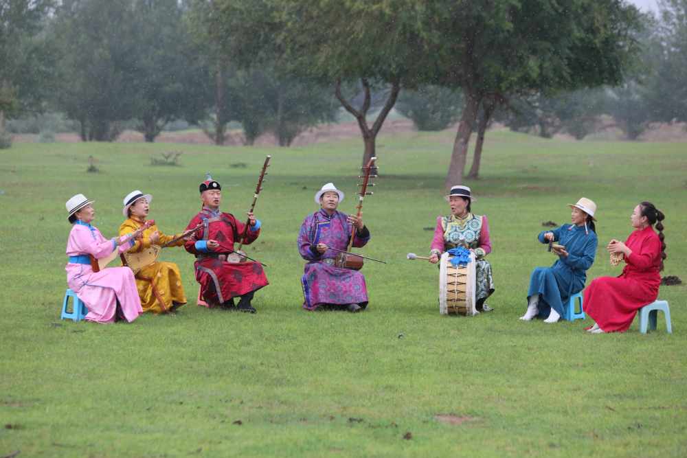 2024年7月16日,《格薩(斯)爾》史詩(shī)說(shuō)唱傳承人在內(nèi)蒙古赤峰市巴林右旗戶外表演。(胡斯楞攝)