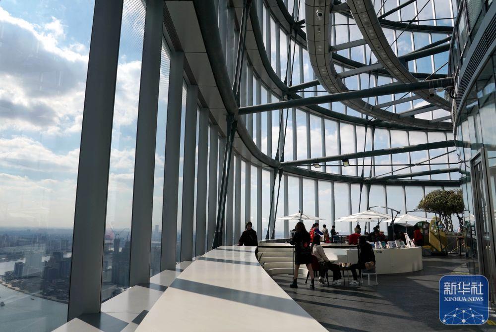 2020年11月12日拍攝的朵云書院觀景臺(tái)。有“云端書店”之稱的朵云書院位于上海中心大廈52層。顧客在這里可以“抬頭看云,低頭讀書”,并俯瞰黃浦江兩岸美景。