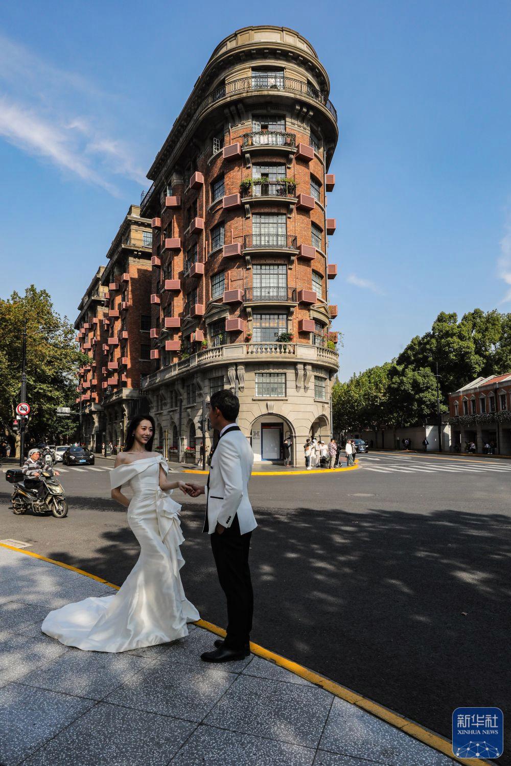 2023年11月3日,一對(duì)新人在海派文化的代表建筑武康大樓前拍攝婚紗照。