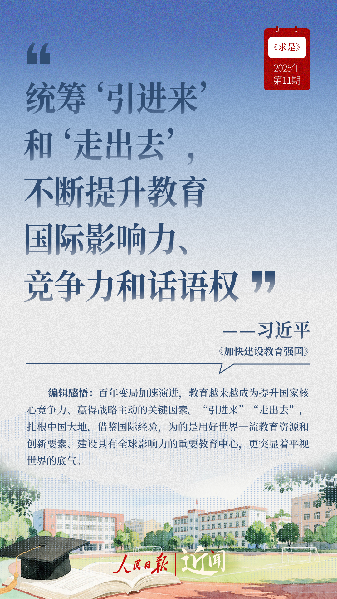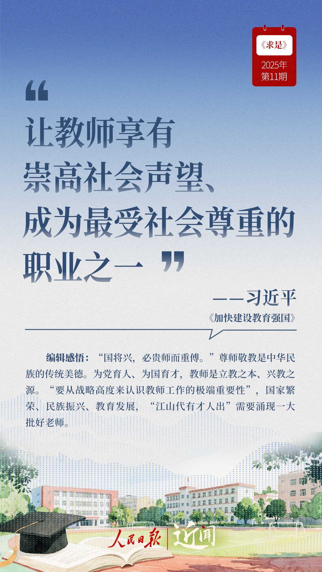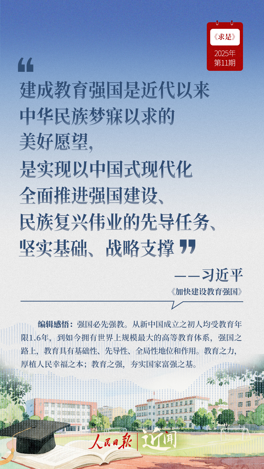 教育是國之大計(jì)、黨之大計(jì)。日前,《求是》雜志發(fā)表習(xí)近平總書記重要文章《加快建設(shè)教育強(qiáng)國》。“全面把握教育的政治屬性、人民屬性、戰(zhàn)略屬性”“讓教育改革發(fā)展成果更多更公平惠及全體人民”“讓教師享有崇高社會聲望、成為最受社會尊重的職業(yè)之一”……通過這些話,一起感悟習(xí)近平總書記對教育強(qiáng)國建設(shè)的謀劃與部署。