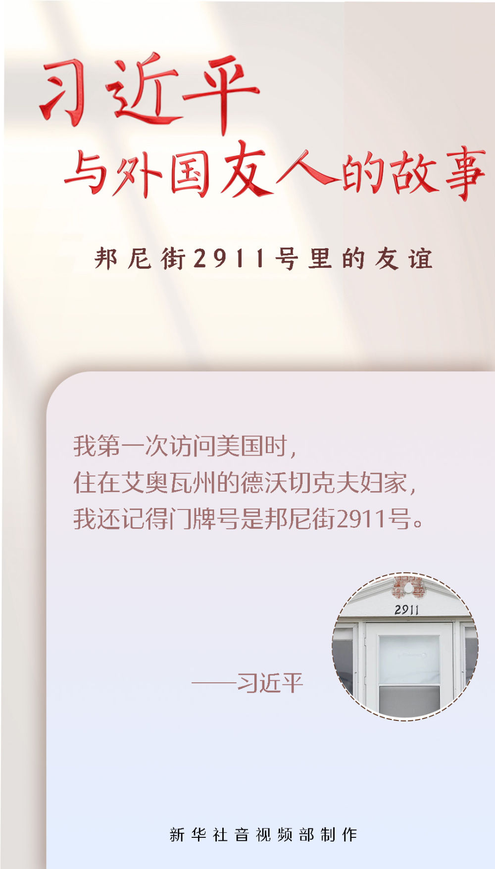 1985年,時(shí)任河北省正定縣委書(shū)記的習(xí)近平率團(tuán)訪問(wèn)艾奧瓦州,住在馬斯卡廷邦尼街2911號(hào)的德沃切克夫婦家中。那是習(xí)近平同美國(guó)民眾首次面對(duì)面接觸,訪問(wèn)期間,他同當(dāng)?shù)厝嗣窠Y(jié)下了深厚友誼。