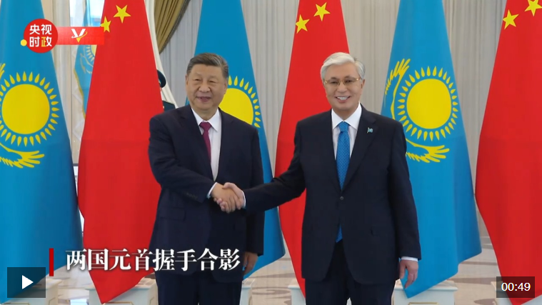 當?shù)貢r間6月16日下午,國家主席習近平乘車抵達阿斯塔納總統(tǒng)府,托卡耶夫總統(tǒng)在下車處迎接。會談前,兩國元首握手合影。