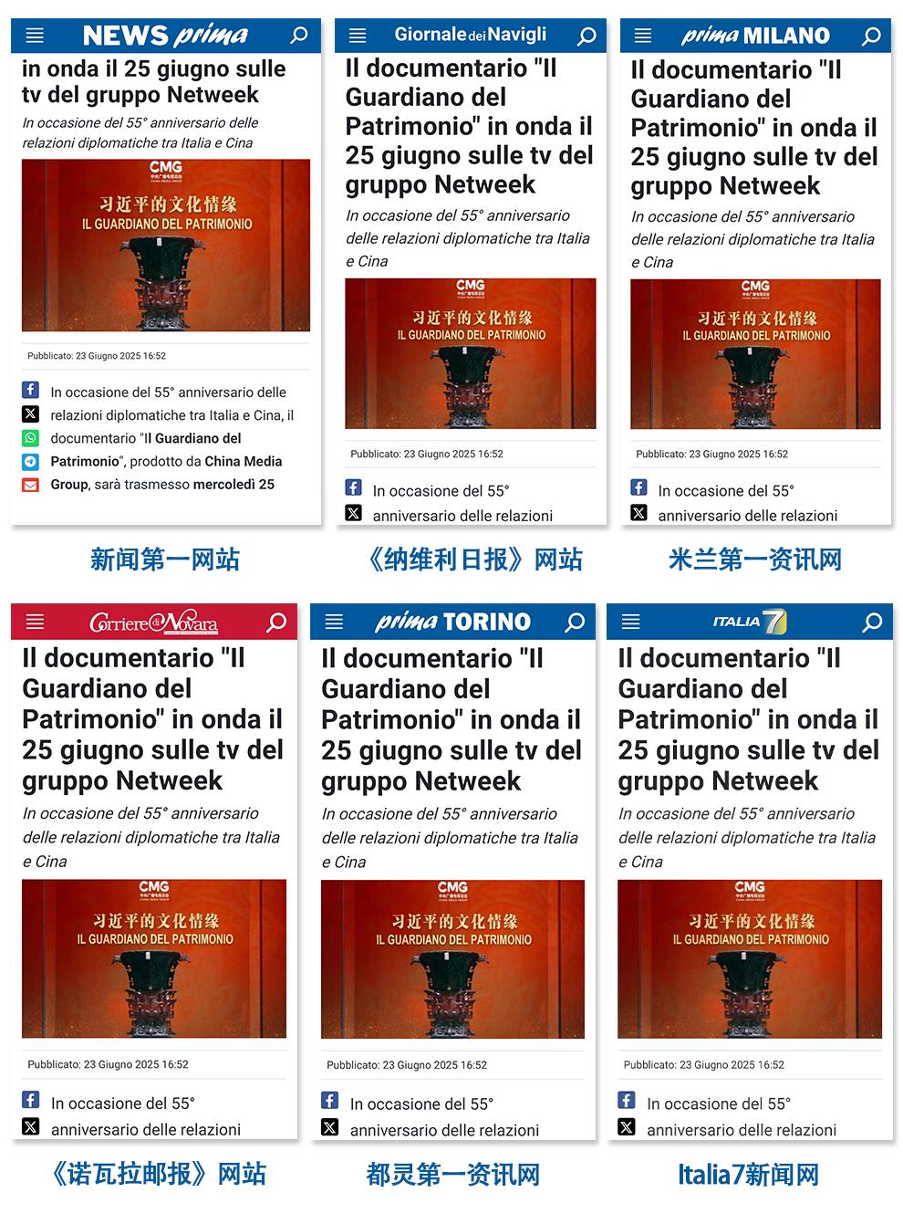 6月25日起,《習(xí)近平的文化情緣》在意大利阿爾瑪電視臺、多納電視臺、旅游電視臺、拉齊奧電視臺、倫巴第城市電視臺、羅馬科羅納廣播電視臺、米蘭帕維亞電視臺,《米蘭財(cái)經(jīng)報(bào)》網(wǎng)站等30多家意主流媒體平臺陸續(xù)上線播出。