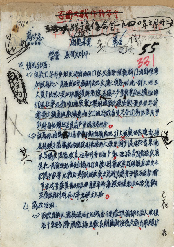 為粉碎侵華日軍的“囚籠政策”、遏制國民黨頑固派的妥協(xié)投降逆流,1940年8月至翌年1月,中國共產黨領導的八路軍在華北發(fā)動了百團大戰(zhàn)。百團大戰(zhàn)第一階段以破襲正太鐵路為重點,這是1940年7月22日簽發(fā)的破襲正太路戰(zhàn)役預備命令(中央檔案館提供)。
