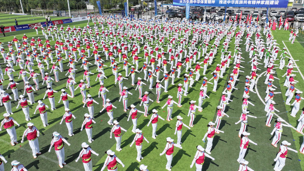2025年6月10日,群眾在寧夏銀川市金鳳區(qū)覽山公園參加千人健身操展演(無人機照片)。當(dāng)日,紀(jì)念“發(fā)展體育運動 增強人民體質(zhì)”題詞73周年全民健身主題活動在覽山公園舉行