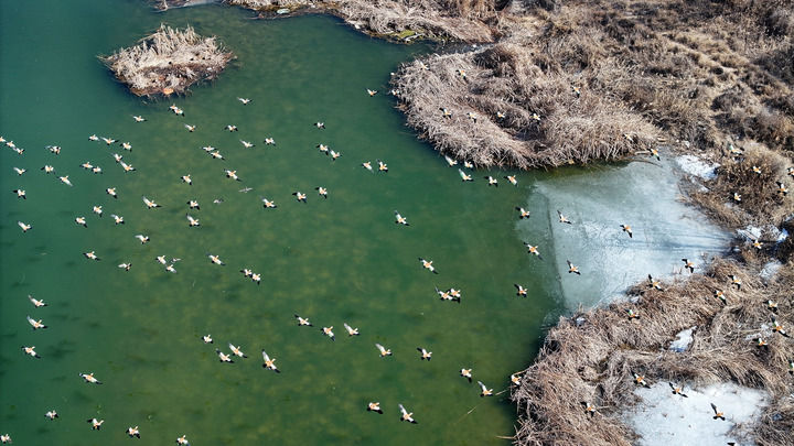 候鳥在黃河寧夏段一處濕地棲息、覓食(2025年2月26日攝,無(wú)人機(jī)照片)。