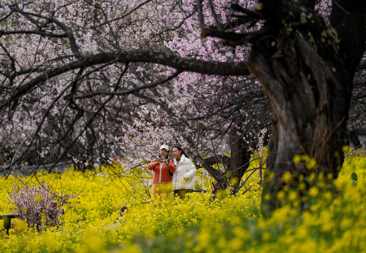 游客在西藏林芝市嘎拉村賞花(2025年4月2日攝)。