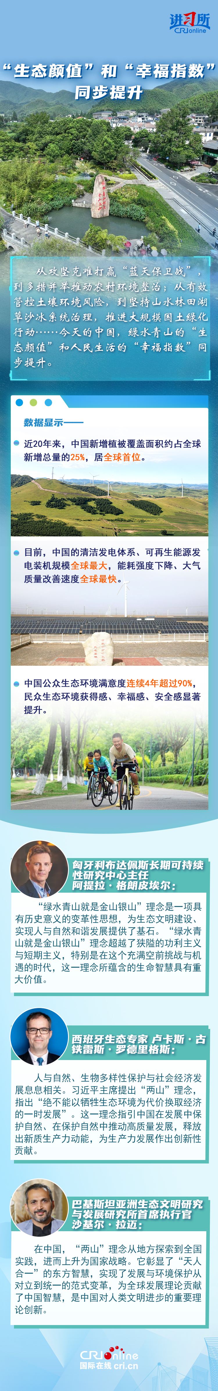 “從歷史長河來看,如果說我們這一代人能留給后人點什么,我看生態(tài)文明建設就是很重要的一個方面。生態(tài)文明建設最能給老百姓帶來獲得感,環(huán)境改善了,老百姓體會也最深。”20年前,時任中共浙江省委書記的習近平在安吉余村考察時,肯定了余村下定決心關閉礦區(qū)、全面走綠色發(fā)展之路的做法,并首次提出“綠水青山就是金山銀山”重要理念,20年來,這一重要理念帶給中國大地一場革命性變化,直接推動美麗中國建設取得歷史性成就。