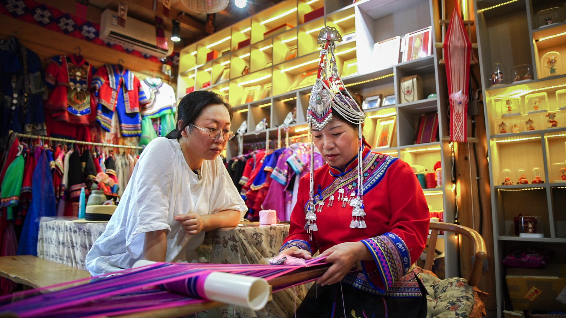 胡珊(左一)在庫村非遺工坊學(xué)做畬族彩帶(央廣網(wǎng)發(fā) 林港 攝)