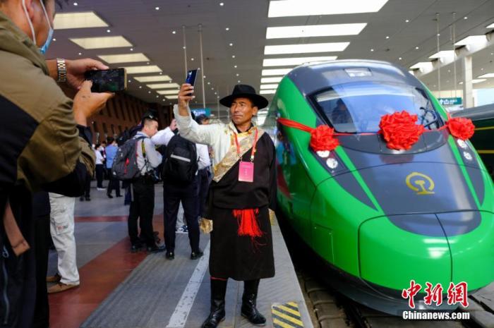 資料圖:民眾在拉薩火車(chē)站復(fù)興號(hào)車(chē)頭前拍照留念。 中新社記者 江飛波 攝