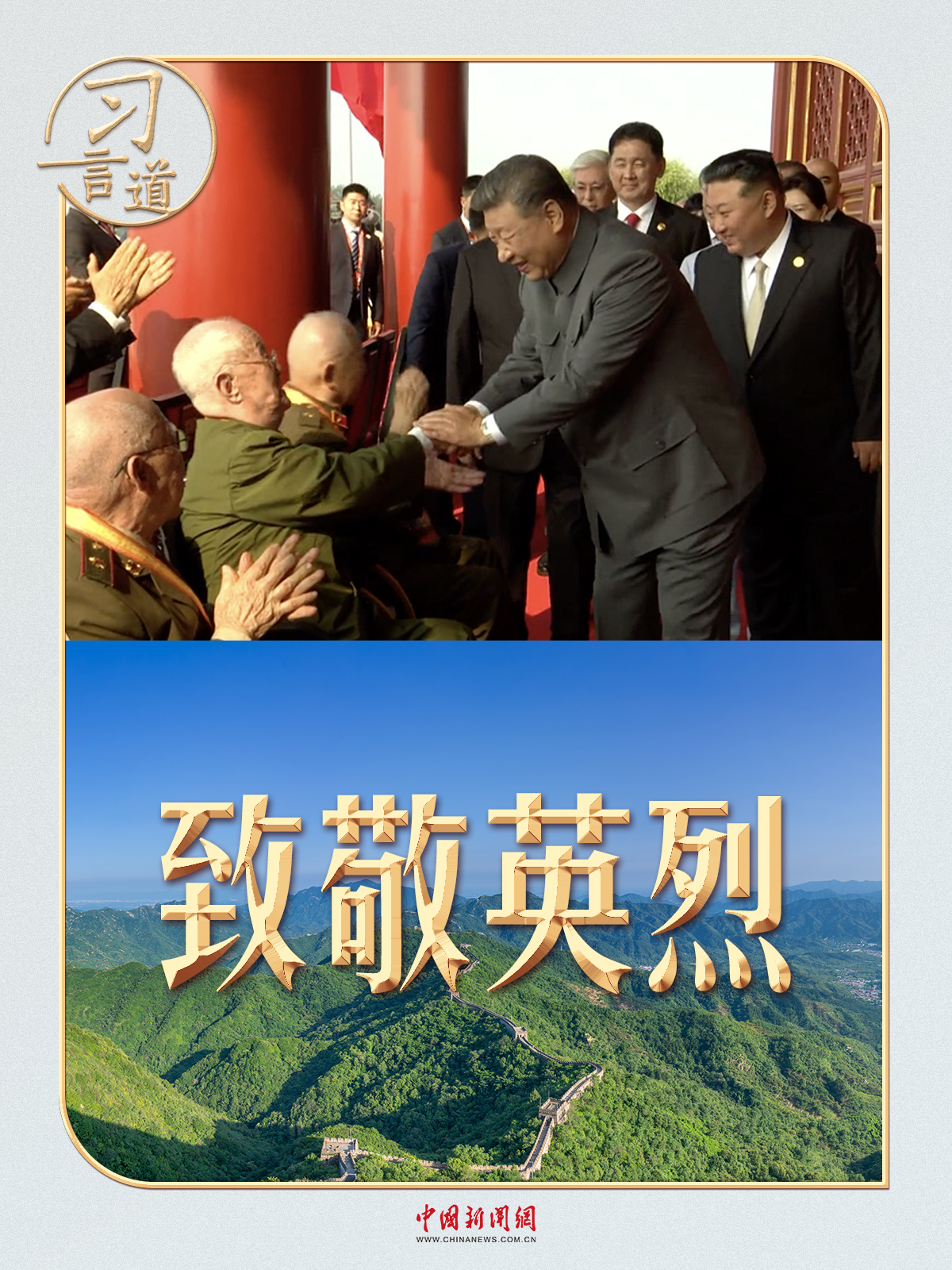 在中國(guó)人民抗日戰(zhàn)爭(zhēng)紀(jì)念館,他仔細(xì)整理花籃上的緞帶,向抗戰(zhàn)烈士致敬;在紀(jì)念活動(dòng)現(xiàn)場(chǎng),他動(dòng)情講述抗戰(zhàn)英烈的壯舉;在人民大會(huì)堂,他為抗戰(zhàn)英雄頒發(fā)沉甸甸的紀(jì)念章;到地方考察,他不忘看望慰問(wèn)抗戰(zhàn)老兵……每一個(gè)瞬間,無(wú)不寄托著習(xí)近平總書記對(duì)英雄烈士的緬懷與敬意。