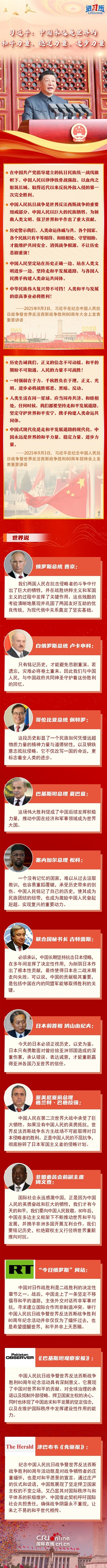 “中國(guó)永遠(yuǎn)是世界的和平力量、穩(wěn)定力量、進(jìn)步力量。”從創(chuàng)建聯(lián)合國(guó)到提出和平共處五項(xiàng)原則,再到推動(dòng)構(gòu)建人類命運(yùn)共同體,中國(guó)始終面向光明,做世界和平與安全的堅(jiān)定維護(hù)者。國(guó)際社會(huì)高度評(píng)價(jià)中國(guó)為世界反法西斯戰(zhàn)爭(zhēng)勝利作出的巨大貢獻(xiàn),認(rèn)為抗戰(zhàn)不僅改寫中國(guó)的命運(yùn),更標(biāo)志著全人類的進(jìn)步;戰(zhàn)后的中國(guó)走上了一條堅(jiān)定不移倡導(dǎo)和平發(fā)展的道路,并以此次紀(jì)念活動(dòng)為契機(jī),呼吁國(guó)際社會(huì)共擔(dān)責(zé)任,確保戰(zhàn)爭(zhēng)陰霾永不重現(xiàn),讓來之不易的和平世代相傳。
