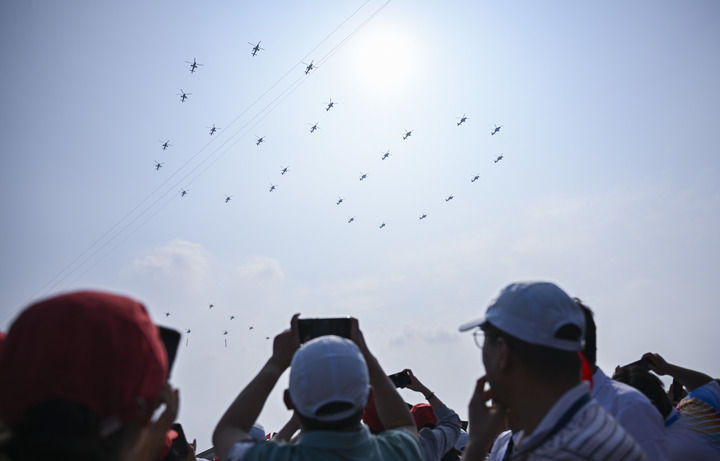 9月3日,習近平總書記同來自五大洲的外國友人并肩站立在天安門城樓上。26架直升機組成巨大的“80”字樣飛過,眾人仰首凝望。