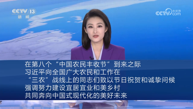 “希望廣大農(nóng)民群眾充分發(fā)揮主動(dòng)性創(chuàng)造性,社會(huì)各界積極支持參與,努力建設(shè)宜居宜業(yè)和美鄉(xiāng)村,共同奔向中國式現(xiàn)代化的美好未來。”在第八個(gè)“中國農(nóng)民豐收節(jié)”到來之際,習(xí)近平總書記向全國廣大農(nóng)民和工作在“三農(nóng)”戰(zhàn)線上的同志們致以節(jié)日祝賀和誠摯問候。