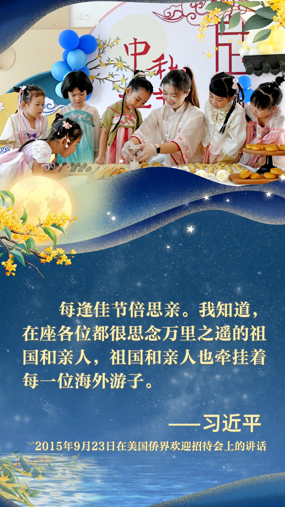 2015年9月23日,中秋佳節(jié)前夕,習(xí)近平總書記在西雅圖出席美國(guó)僑界歡迎招待會(huì)。他為參加招待會(huì)的同胞們帶去了來自家鄉(xiāng)的月餅,并熱情地“歡迎大家常回家看看”。