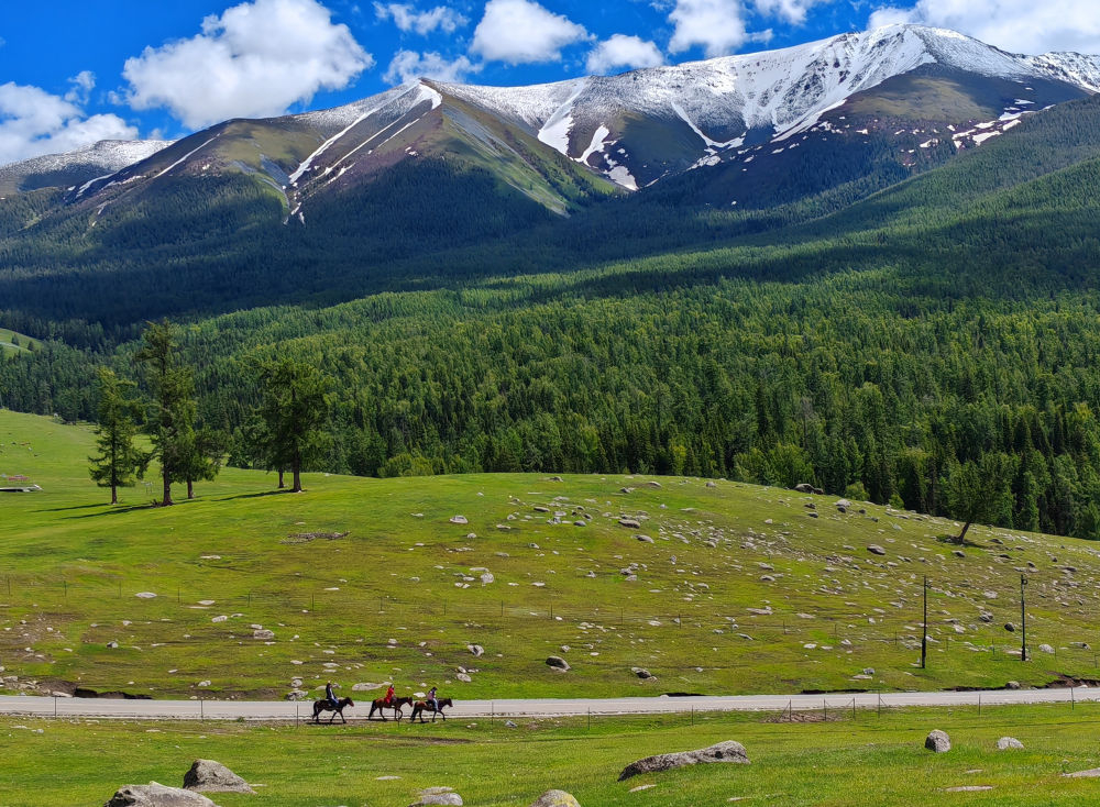 2024年6月4日,游客在新疆阿勒泰地區(qū)哈巴河縣騎馬游玩。電視劇《我的阿勒泰》播出后,新疆阿勒泰地區(qū)迎來客流高峰,“張鳳俠的小賣部”“巴太樹”“彩虹布拉克”等劇中地點成為熱門旅游打卡地。這場“邊城”與“熱劇”雙向奔赴的文旅盛宴,為當?shù)亟洕l(fā)展帶來新的增長點。2024年5月,當?shù)亟哟慰?15.03萬人次,同比增長60.81%;實現(xiàn)旅游收入36.53億元,同比增長88.25%。