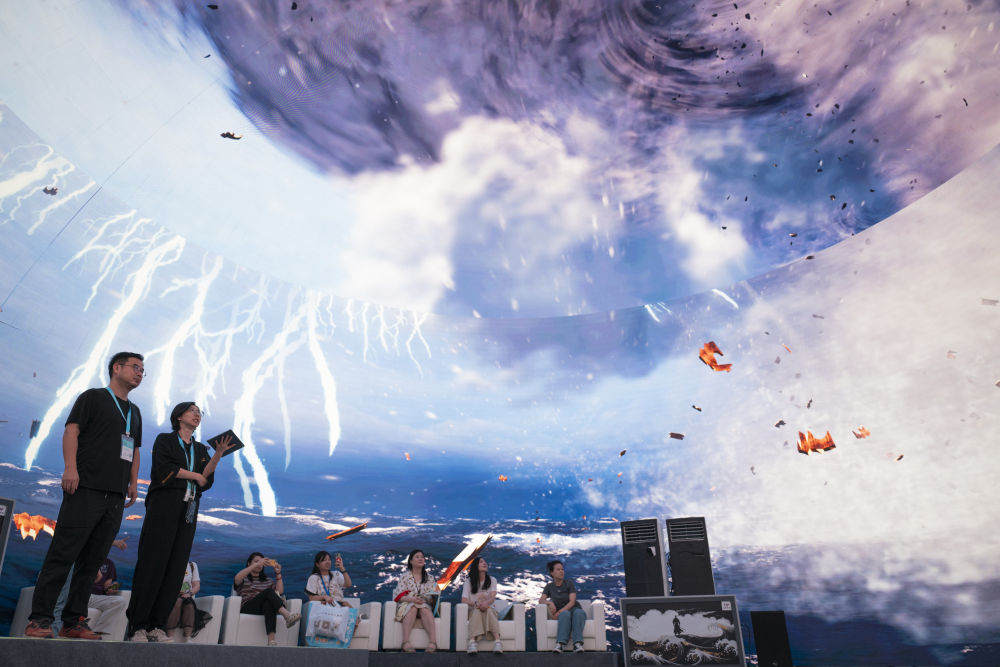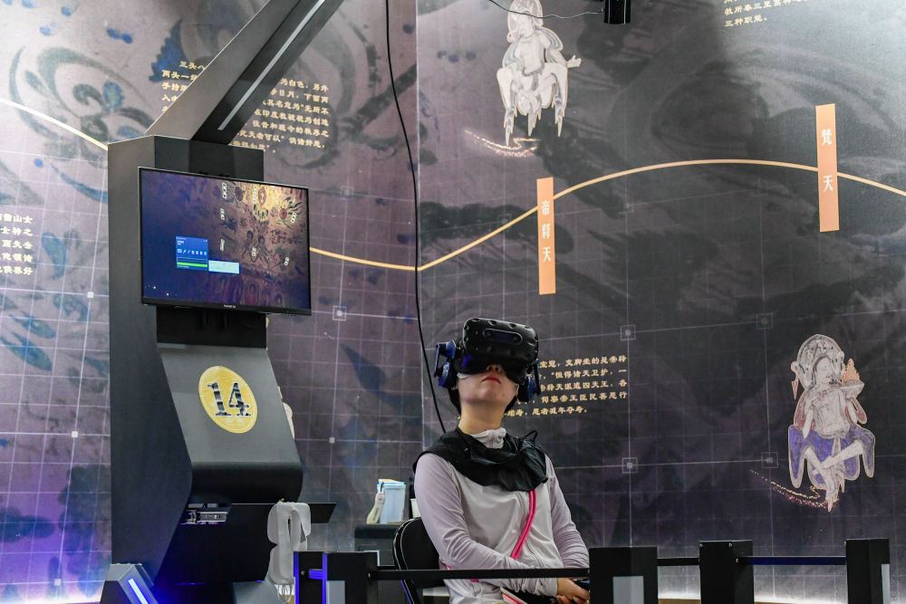 2024年7月22日,游客在“尋境敦煌——數(shù)字敦煌沉浸展”借助VR設備沉浸式游覽莫高窟第285窟虛擬場景?!皩ぞ扯鼗汀獢?shù)字敦煌沉浸展”綜合運用VR虛擬現(xiàn)實、三維建模、游戲引擎的物理渲染和全局動態(tài)光照等新技術,高精度立體還原了莫高窟第285窟。游客戴上VR眼鏡,不僅可以零距離觀賞壁畫、360度自由探索洞窟細節(jié),還能“飛升”到窟頂,身臨其境參與壁畫故事情節(jié),沉浸式感受敦煌文化的魅力。