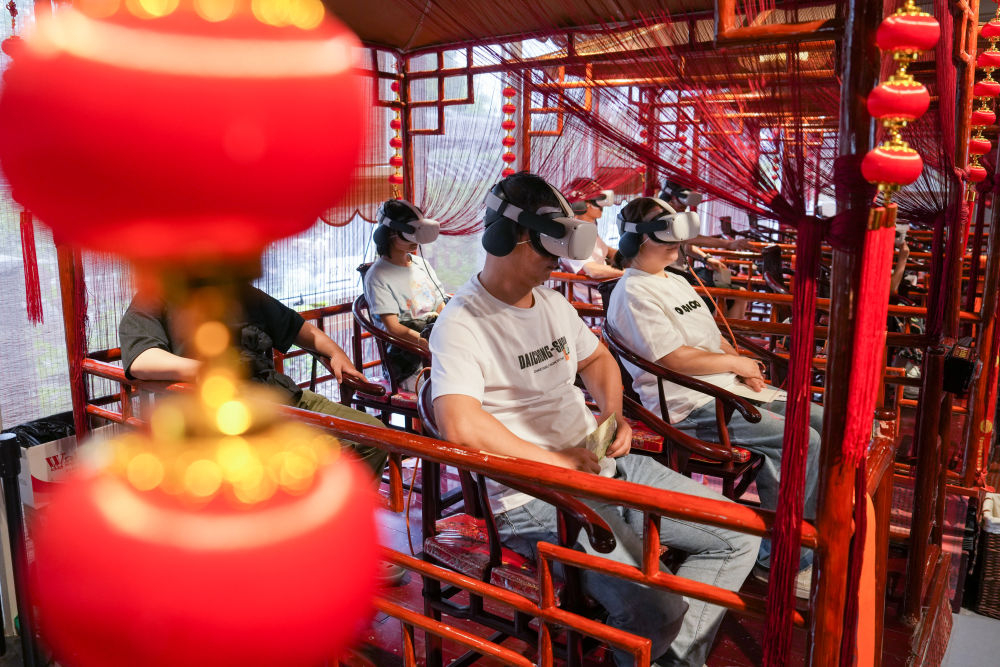 2025年5月18日,游客在蘇州拙政園體驗VR漫游。當?shù)乩脭?shù)字化手段,創(chuàng)造“數(shù)字云游”VR場景,打造“云游拙政園”“獅林園宇宙”“留園虛擬元宇宙”等項目,營造真實可感的虛擬空間,讓觀眾沉浸式感受蘇州園林的獨特魅力。近年來,蘇州不斷推進“數(shù)字園林”建設,在園林整體數(shù)字建模、園林要素數(shù)據(jù)庫建設、園林“元宇宙”應用場景開發(fā)等方面進行探索,加快推動“數(shù)字園林”成果全民共享。