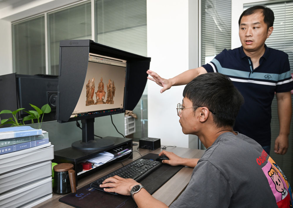 2023年8月3日,敦煌研究院文物數(shù)字化研究所的工作人員在展示莫高窟彩塑三維重建的成果。近年來(lái),敦煌研究院持續(xù)加大文物保護(hù)基礎(chǔ)研究和應(yīng)用研究,不斷加強(qiáng)文物科技保護(hù)力度,提升科研平臺(tái)建設(shè),為文物保護(hù)和文化遺產(chǎn)事業(yè)發(fā)展奠定良好基礎(chǔ)。