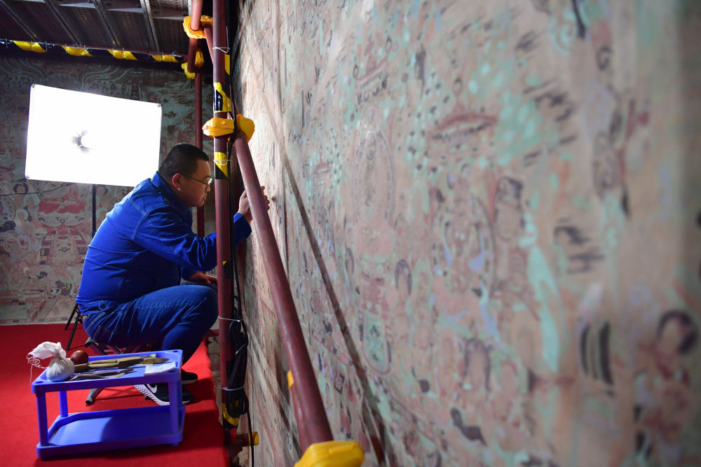2022年4月19日,敦煌研究院文物保護(hù)技術(shù)服務(wù)中心的壁畫修復(fù)師楊金禮在莫高窟第231窟內(nèi)修復(fù)壁畫。