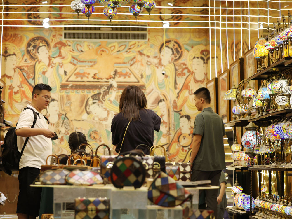 2025年6月26日,游客在敦煌夜市選購(gòu)文創(chuàng)產(chǎn)品。今年以來(lái),敦煌市全面改造敦煌夜市等特色街區(qū),圍繞敦煌深厚的歷史文化底蘊(yùn),融入壁畫、絲路文化等元素,通過(guò)布設(shè)文化景觀小品、打造沉浸式餐飲體驗(yàn)空間、上線特色文創(chuàng)產(chǎn)品等方式,給游客帶來(lái)多元體驗(yàn),“夜經(jīng)濟(jì)”持續(xù)升溫,不斷釋放文旅消費(fèi)潛力。
