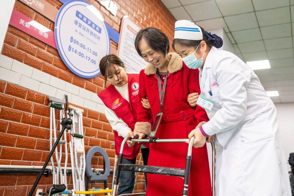 2025年11月6日,志愿者及醫(yī)務(wù)人員在湖南長沙望城區(qū)高塘嶺街道中南社區(qū)幫助行動不便的居民使用康復(fù)器具。