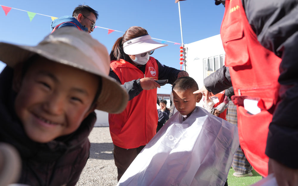 2025年1月26日,志愿者在西藏拉孜縣吉如村安置點為孩子們理發(fā)。西藏定日縣6.8級地震發(fā)生后,志愿者們迅速參與救援搜救、協(xié)助搭建帳篷、搬運賑濟物資、協(xié)調(diào)村民所需。數(shù)百名大學(xué)生組成志愿者服務(wù)隊,白天為安置點的孩子們輔導(dǎo)作業(yè)、陪孩子們運動;晚上組成巡邏隊,守護安置點的安寧。