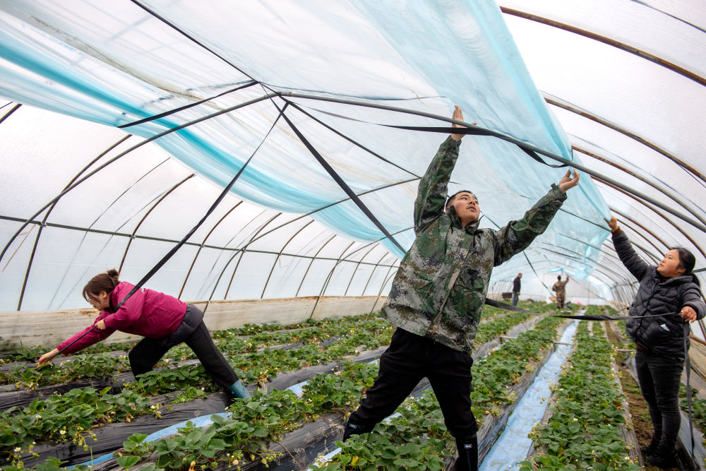 2023年12月15日,志愿者在浙江湖州長興縣水口鄉(xiāng)幫助農(nóng)戶加蓋大棚保溫膜。為應(yīng)對強雨雪天氣,志愿者們幫助農(nóng)戶清理大棚上的積雪,加裝綁棚繩,棚內(nèi)增設(shè)立柱,提高大棚抗風(fēng)雪能力,確保農(nóng)產(chǎn)品正常生產(chǎn)供應(yīng)。
