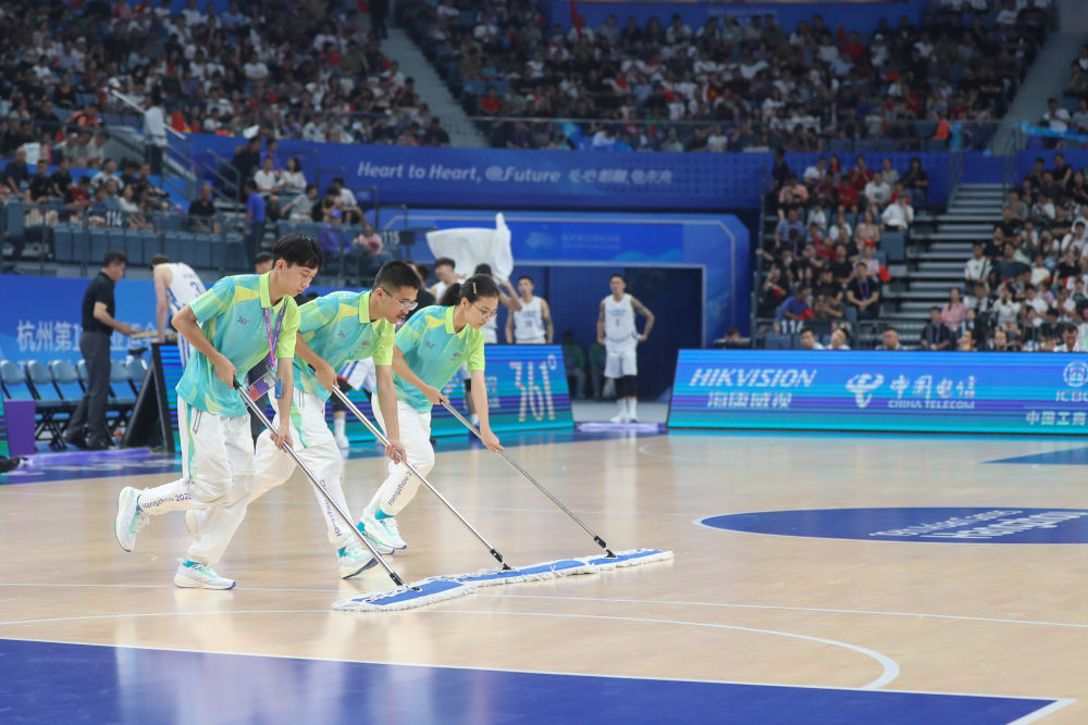 2023年9月28日,杭州亞運會志愿者“小青荷”在杭州亞運會籃球男子預(yù)賽B組比賽前清潔場地。從2016年二十國集團領(lǐng)導(dǎo)人杭州峰會以來,“小青荷”這一志愿服務(wù)工作品牌已成為杭州大型賽會服務(wù)的一張金名片。