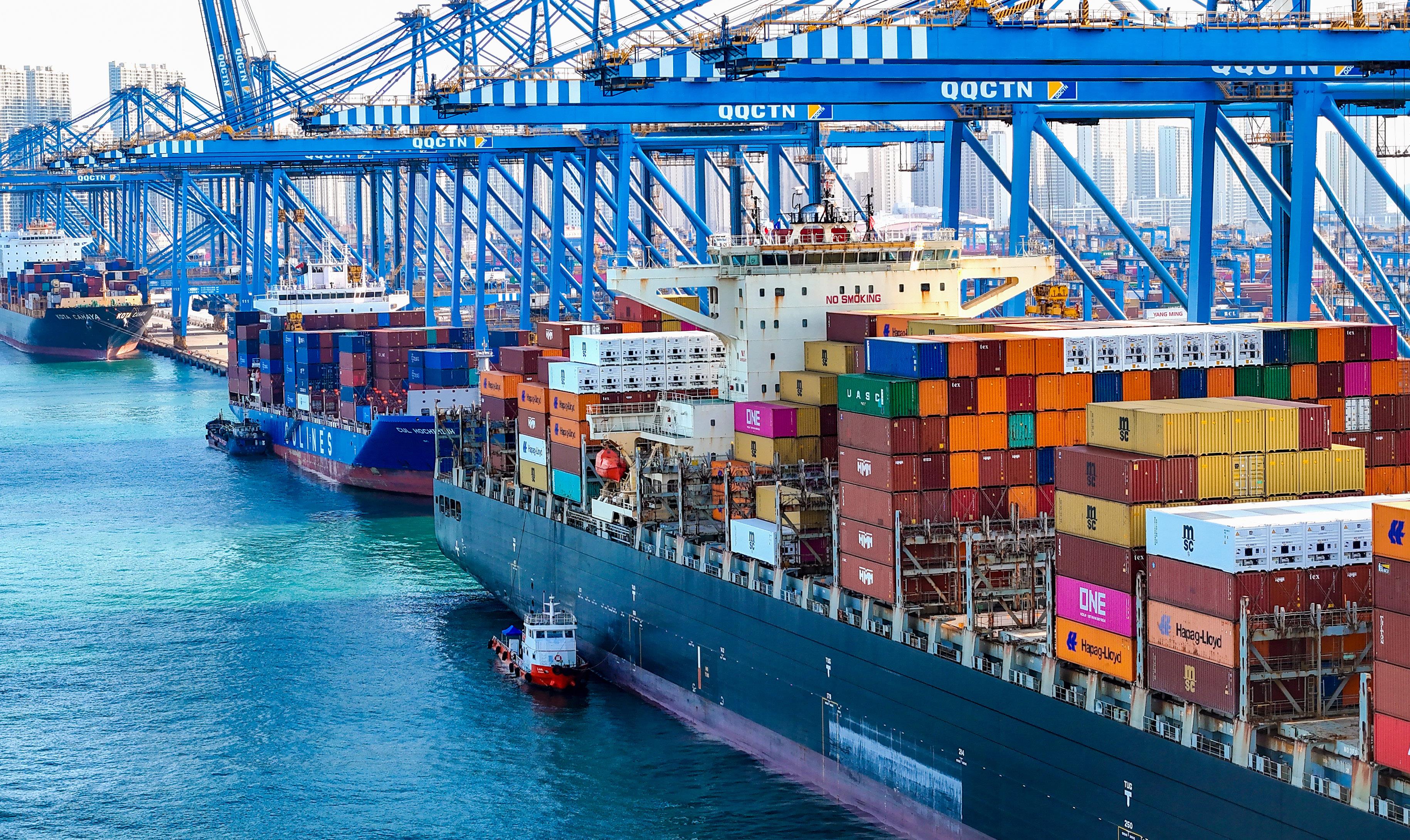 △貨輪在山東港口青島港全自動化碼頭裝卸貨物。