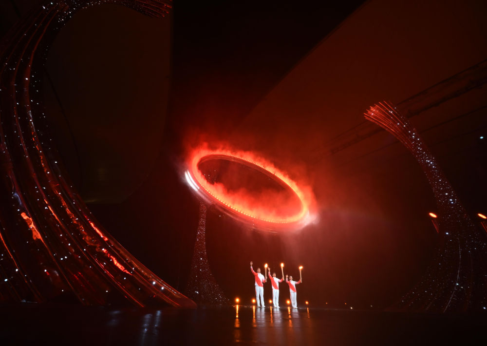 2025年11月9日,第十五屆全國運動會開幕式在廣東奧林匹克體育中心舉行。這是火炬手蘇炳添(中)、張家朗(左)、李祎點燃主火炬后向觀眾致意。新華社記者 肖藝九 攝
