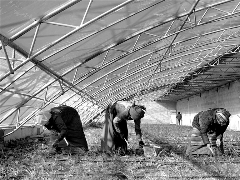 技術(shù)員達(dá)瓦次仁正在大棚里指導(dǎo)園區(qū)的員工種植藏紅花的種球。挖坑、放種球、填土……一套動(dòng)作下來(lái),一顆種球就被完美地種下了。