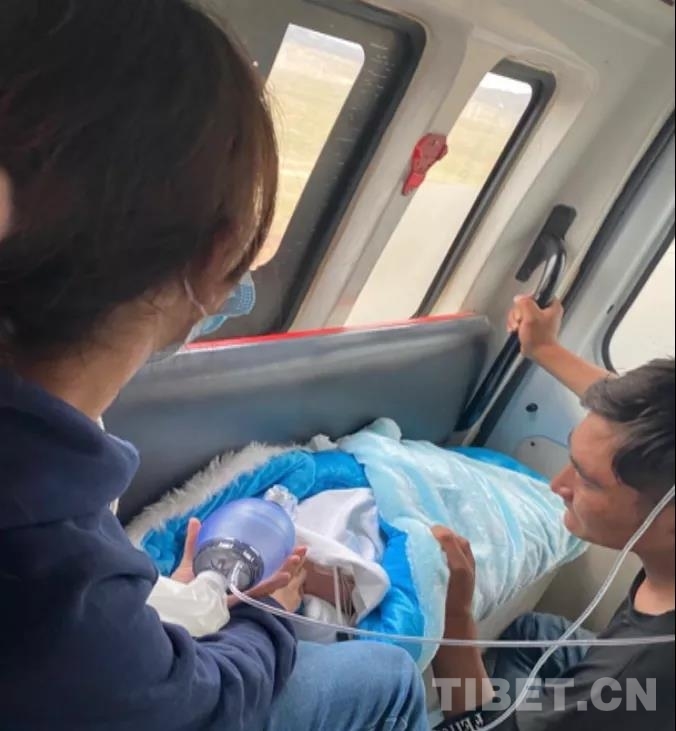 路途的顛簸及病情的反復(fù),患兒在面罩吸氧下血氧飽和度下降至50-60%,呼吸急促、體溫達(dá)到39.9℃,并再次出現(xiàn)軀體抽動(dòng)。醫(yī)務(wù)人員在轉(zhuǎn)運(yùn)途中對(duì)患兒加大氧流量并改為持續(xù)球囊壓迫給氧,加強(qiáng)物理降溫,繼續(xù)予升壓、抗感染、補(bǔ)液等處理,患兒的體溫較前下降,但血氧飽和度仍然不穩(wěn)定,心率波動(dòng)大,數(shù)次下降至90次/分以下,一度出現(xiàn)室性心律,醫(yī)務(wù)人員數(shù)次給予各項(xiàng)強(qiáng)心、轉(zhuǎn)律、吸痰等搶救措施,并繼續(xù)持續(xù)球囊壓迫給氧加強(qiáng)氧合。如此反復(fù),一路救治,患兒和醫(yī)務(wù)人員終于在次日凌晨一點(diǎn)二十分,抵達(dá)西藏自治區(qū)人民醫(yī)院。