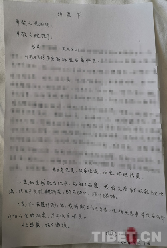 住院期間,索南吉的身份就是病人,對這個未知的疾病難免害怕,好的和不好的結(jié)局,她都反復(fù)想到了。作為一名參加過2003年非典和2010年甘肅舟曲特大泥石流一線救治工作的醫(yī)務(wù)工作者、有13年黨齡的共產(chǎn)黨員,她在住院的第2天,便向護士借來了筆和紙,在床頭向醫(yī)院鄭重寫下了請愿書:“一是如果我配合治療,戰(zhàn)勝了病魔,我將無償捐獻自己(的)血清,供醫(yī)療實驗研究。二是萬一病魔打倒了我,我將獻出自己身體,供相關(guān)醫(yī)療單位(開展)具有針對性的實驗研究,盡早攻克(新冠肺炎治療的)難關(guān)?!?/p>