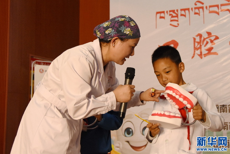 湖南援藏醫(yī)生李毅萍在講解口腔衛(wèi)生知識(shí)(9月18日攝)。新華網(wǎng) 張宸攝