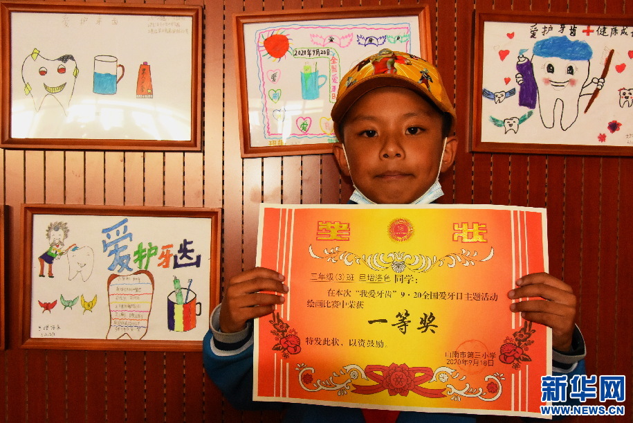 三年級(jí)學(xué)生旦增洛色所作的繪畫“愛護(hù)牙齒”得了一等獎(jiǎng),現(xiàn)場(chǎng)拿到獎(jiǎng)狀的他很是興奮。“叔叔阿姨們給我們講了很多愛護(hù)牙齒的知識(shí),還叮囑我們要養(yǎng)成刷牙的好習(xí)慣?!钡┰雎迳f,“我會(huì)把了解到的這方面知識(shí),告訴身邊所有人,讓他們也都有健康的牙齒。”