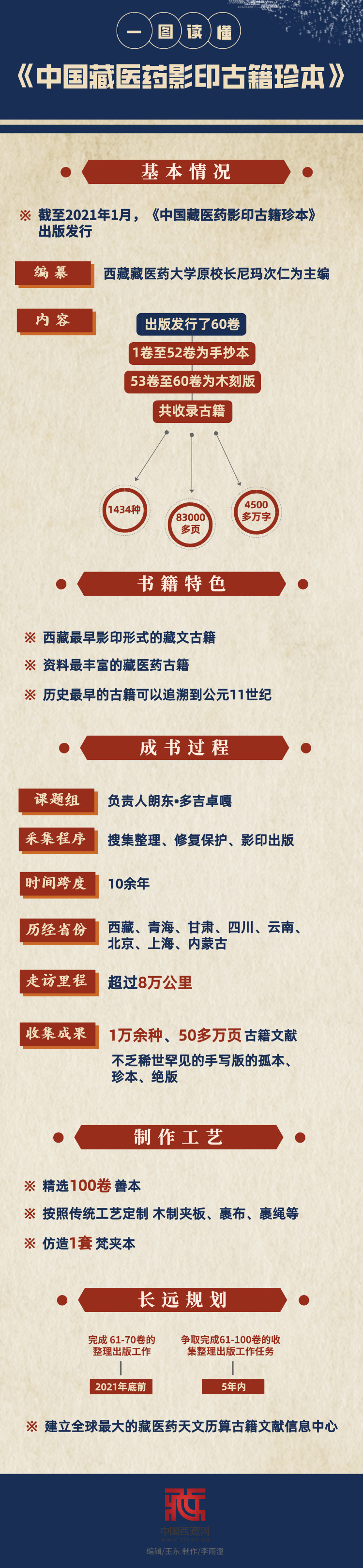 截至2021年1月,以西藏藏醫(yī)藥大學(xué)原校長尼瑪次仁為主編的《中國藏醫(yī)藥影印古籍珍本》已出版發(fā)行了60卷,共收錄古籍1434種、83000多頁、4500多萬字。[詳細(xì)] -