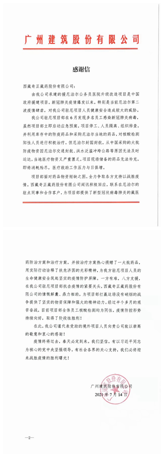 患者經(jīng)多次核酸檢測轉(zhuǎn)陰未復陽后,廣州建筑集團特地給西藏奇正藏藥股份有限公司寫了一份感謝信,信中寫到:西藏奇正藏藥股份有限公司為項目部提供了新型冠狀病毒肺炎的藏醫(yī)藥防治方案和治療方案,并按治療方案熱心捐贈了一大批藥品,用實際行動詮釋了扶危濟困的光彩精神,為我方駐尼項目人員的生命健康安全筑起堅實的疫情防護屏障。一方有難,八方支援,在我公司駐尼項目部抗擊疫情的緊要關(guān)頭,西藏奇正藏藥股份有限公司的慷慨解囊、鼎力相助,為項目部打贏這場沒有硝煙的戰(zhàn)爭提供了堅實的物資保障和強大的精神動力。