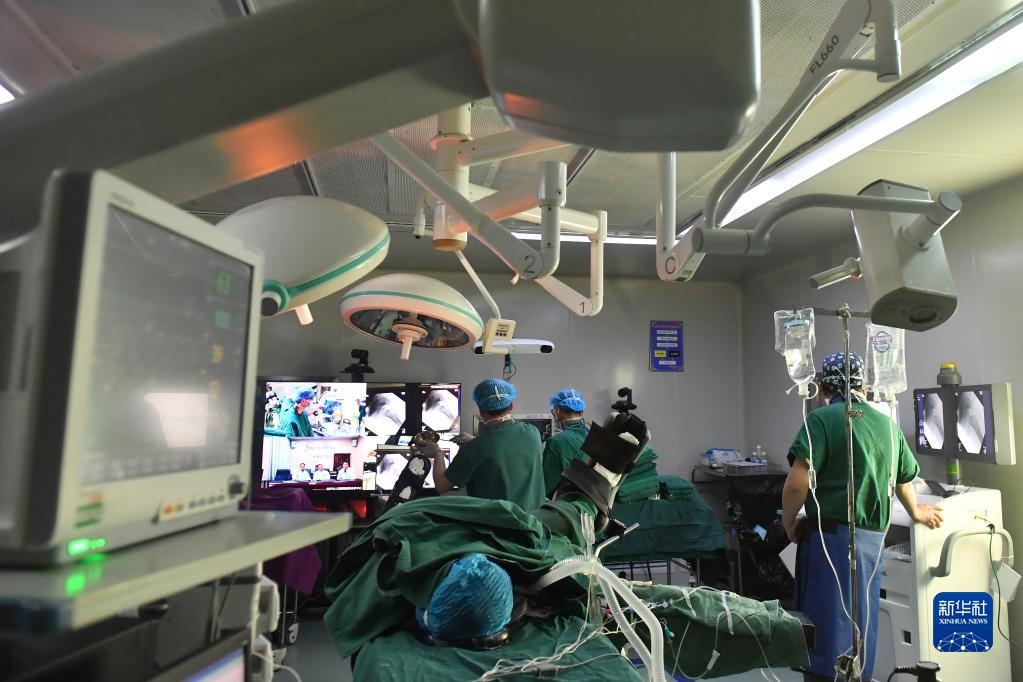 拉薩市人民醫(yī)院骨科醫(yī)生在北京積水潭醫(yī)院專家遠(yuǎn)程指導(dǎo)下使用骨科機(jī)器人開展骨科手術(shù)(2021年4月19日攝)。新華社記者 孫瑞博 攝