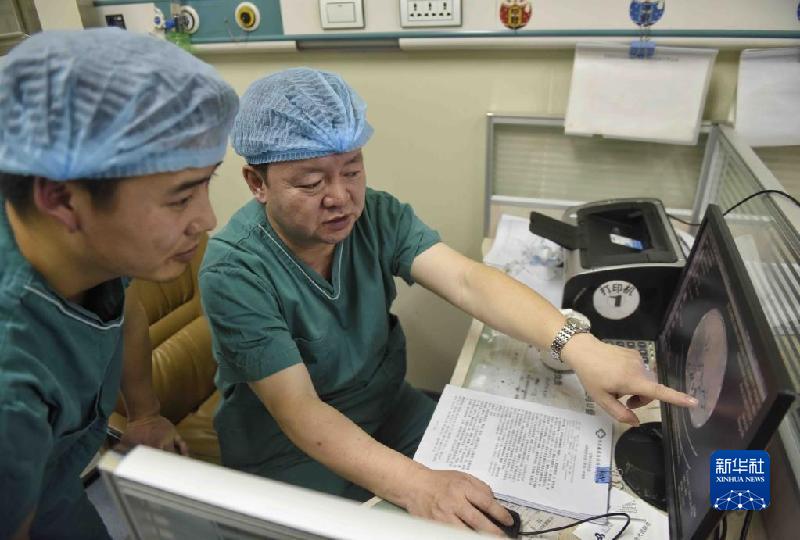 2020年1月16日,在甘孜州人民醫(yī)院,王文濤(右)指導(dǎo)當?shù)蒯t(yī)務(wù)人員。新華社記者 劉坤 攝