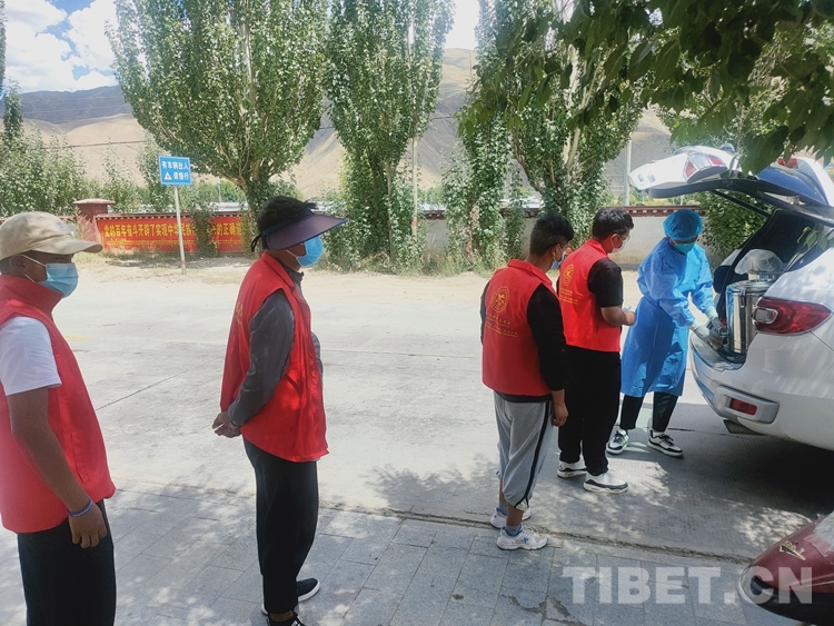圖為瓊結(jié)縣藏醫(yī)院醫(yī)護(hù)人員在瓊結(jié)縣產(chǎn)業(yè)園隔離點(diǎn)給隔離人員送飯