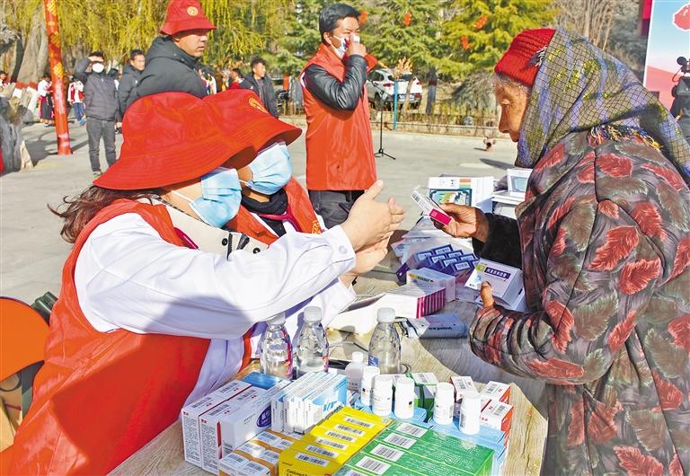 圖為自治區(qū)衛(wèi)生健康系統(tǒng)的志愿者在瓊結(jié)縣為群眾贈藥、解答健康問題。記者 劉楓 攝