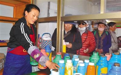 沖賽康“愛心飯館”位于拉薩老城區(qū)核心地帶,因“愛心飯館”飯菜量足、甜茶味道好,深受廣大居民群眾的喜愛。記者來到?jīng)_賽康“愛心飯館”時(shí),飯館內(nèi)早已座無虛席,每個(gè)窗口前都排滿了人,廚房內(nèi)的工作人員更是忙得不可開交?!疤鸩枰呀?jīng)賣完了,請稍等一會兒,我們馬上做?!狈?wù)員向客人說道。