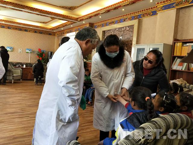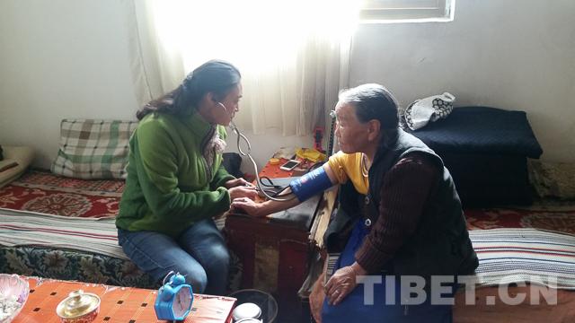 圖為次仁卓瑪(左)在為老人進(jìn)行體檢。