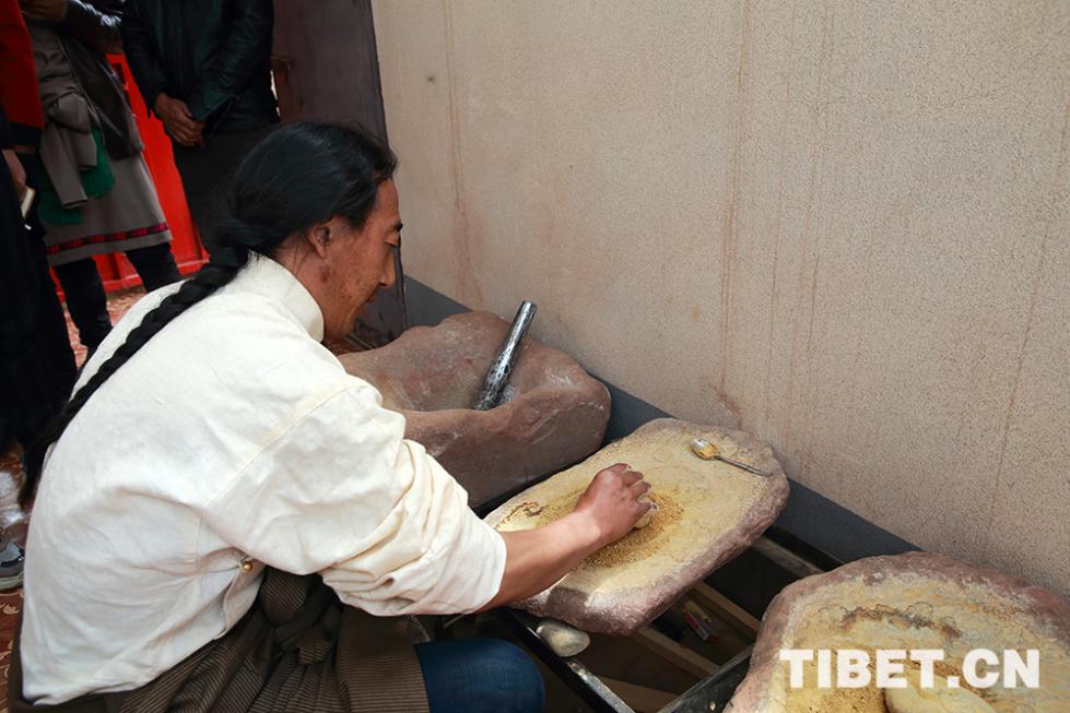 圖為貢桑曲登正在研磨藥材。攝影:陳衛(wèi)國
