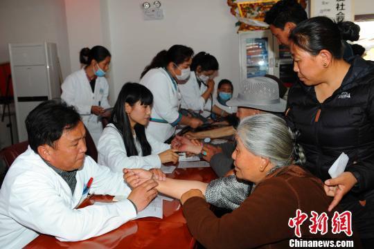 西藏自治區(qū)藏醫(yī)院醫(yī)生為社區(qū)老人把脈。 曾彬 攝