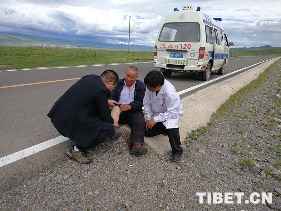 老人說自己的膝關(guān)節(jié)總是會(huì)疼,剛才在路邊站了一個(gè)多小時(shí),腫脹疼痛更加嚴(yán)重??吹竭@種情況,來自北京市昌平區(qū)醫(yī)院的骨科主任王現(xiàn)海立即在公路邊開始診治。詢問病史及進(jìn)行體格檢查后,醫(yī)生診斷為右膝關(guān)節(jié)骨性關(guān)節(jié)炎。隨后與歐拉秀瑪鄉(xiāng)衛(wèi)生院院長(zhǎng)楊河軍及其他專家一起將老人抬上救護(hù)車,讓他躺在救護(hù)車的擔(dān)架上,進(jìn)行了腰椎及髖關(guān)節(jié)的體檢,排除了腰椎及髖部疾患的可能。王現(xiàn)海輔導(dǎo)老人進(jìn)行針對(duì)膝關(guān)節(jié)骨性關(guān)節(jié)炎的康復(fù)鍛煉,建議其口服消炎止痛類藥物,并到上級(jí)醫(yī)院進(jìn)一步檢查明確病情。老人連忙稱謝。